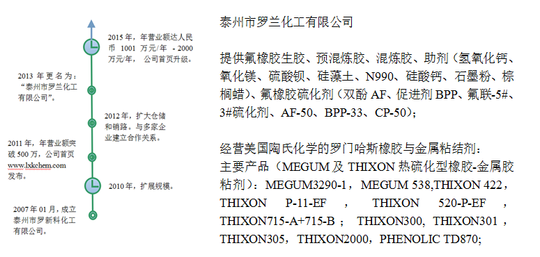 泰州市羅蘭化工有限公司向您提供氟橡膠生膠、預混煉膠、混煉膠、助劑(氫氧化鈣、氧化鎂、硫酸鋇、硅藻土、N990、硅酸鈣、石墨粉、棕櫚蠟)、氟橡膠硫化劑(雙酚AF、促進劑BPP、氟聯(lián)-5#、3#硫化劑、AF-50、BPP-33、CP-50);經(jīng)營美國陶氏化學的羅門哈斯橡膠與金屬粘結劑,主要產(chǎn)品(MEGUM及THIXON熱硫化型橡膠-金屬膠粘劑):MEGUM3290-1,MEGUM 538,THIXON 422,THIXON P-11-EF,THIXON 520-P-EF,THIXON715-A+715-B;THIXON300,THIXON301,THIXON305,THIXON2000,PHENOLIC TD870;